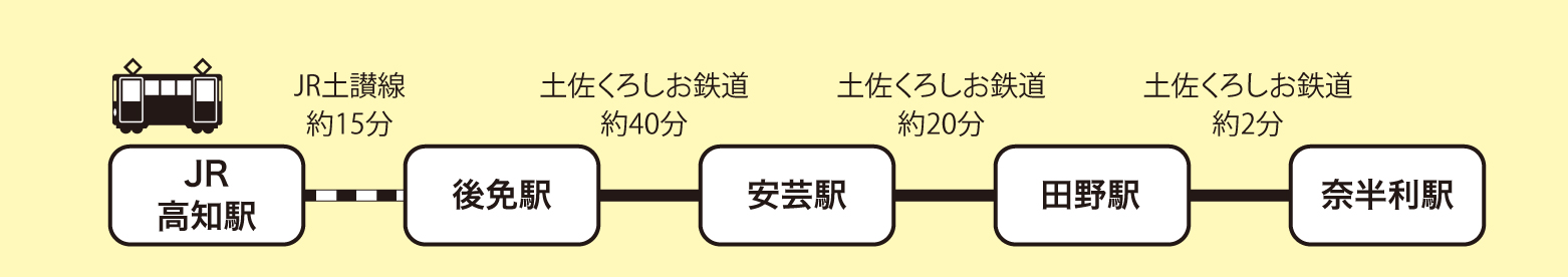 - 高知駅バスターミナルからとさでん交通バスで安芸営業所へ。高知東部交通バスに乗り換え、「田野役場通」または「奈半利駅」で下車。