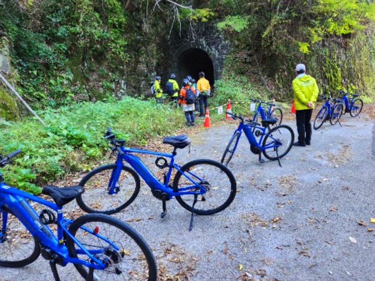 安田川沿いの旧森林鉄道跡をEバイク(電動自転車)でガイドと一緒に巡るプラン。爽やかな風を受けて風景を楽しみましょう。