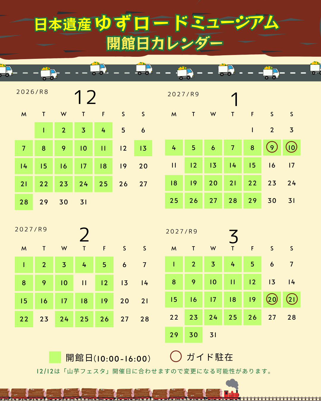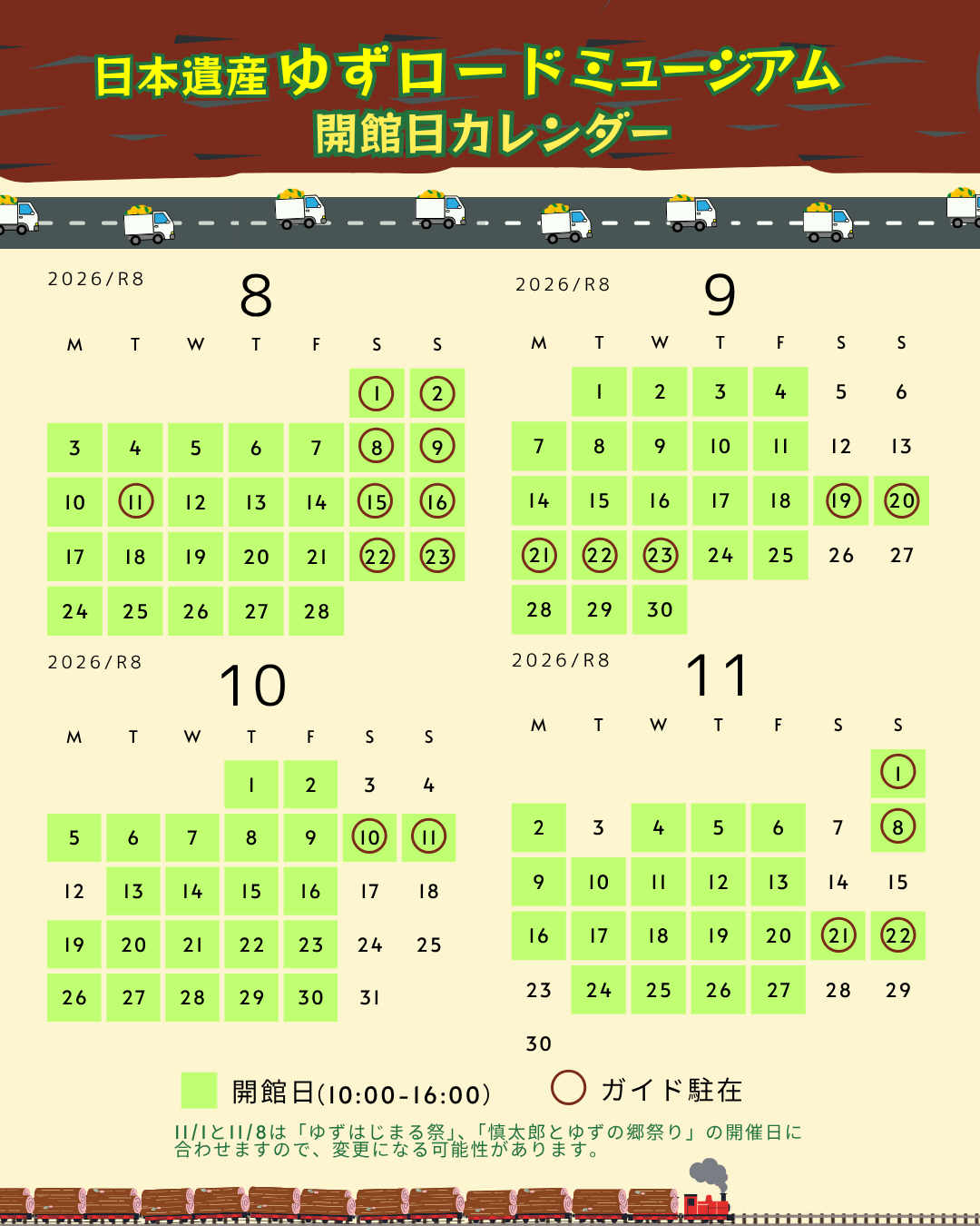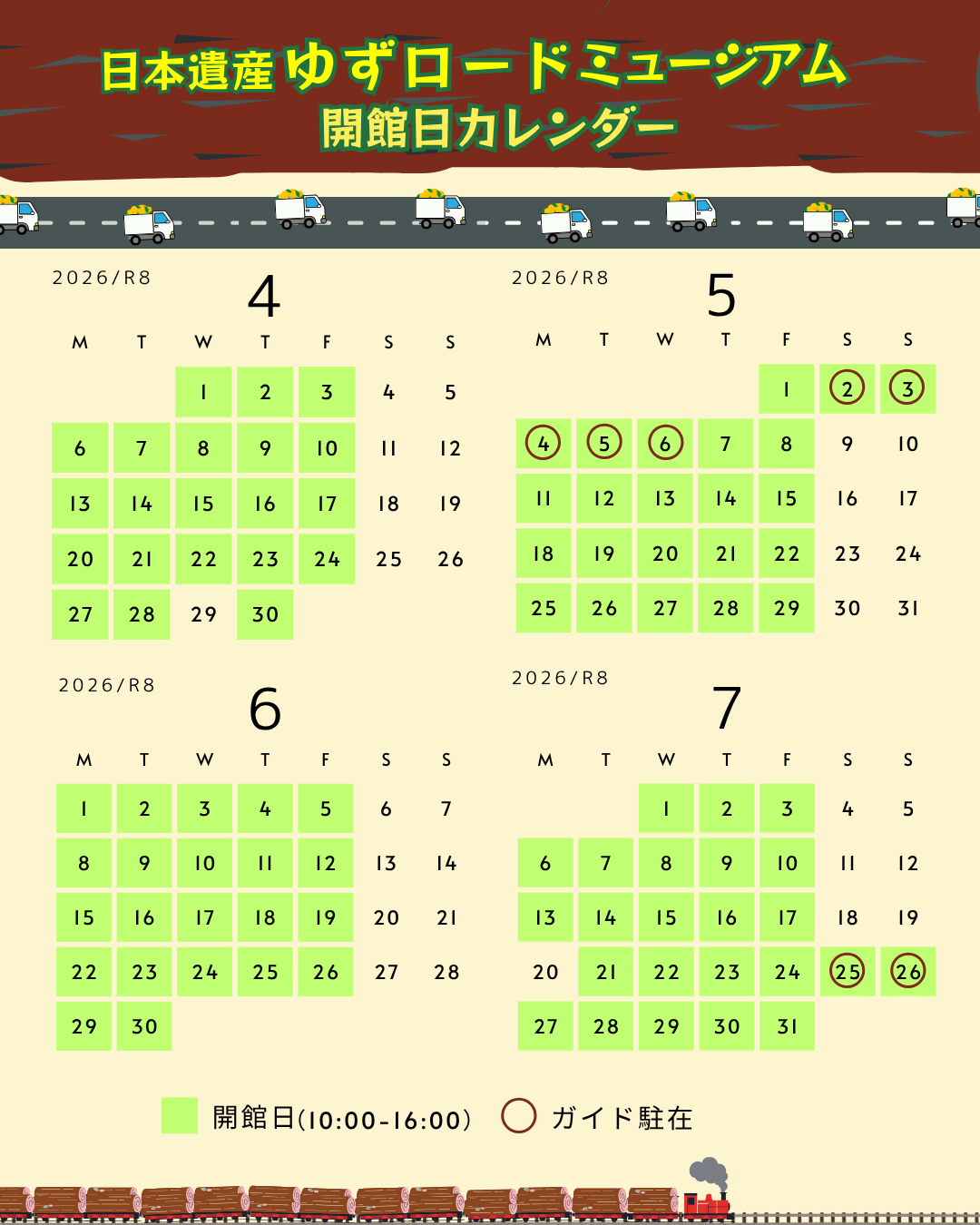 お知らせ 令和8年度日本遺産ゆずロードミュージアム開館カレンダー 更新日:2026.04.16 令和8年度日本遺産ゆずロードミュージアム開館カレンダー 令和8年度の日本遺産ゆずロードミュージアムについて、以下の日程で開館します。 土日祝日の開館には日本遺産中芸ゆずと森林鉄道ガイド会のガイドが駐在しますので、気になる事は質問するなどぜひお声がけください。 4~7月 8~11月 12~3月