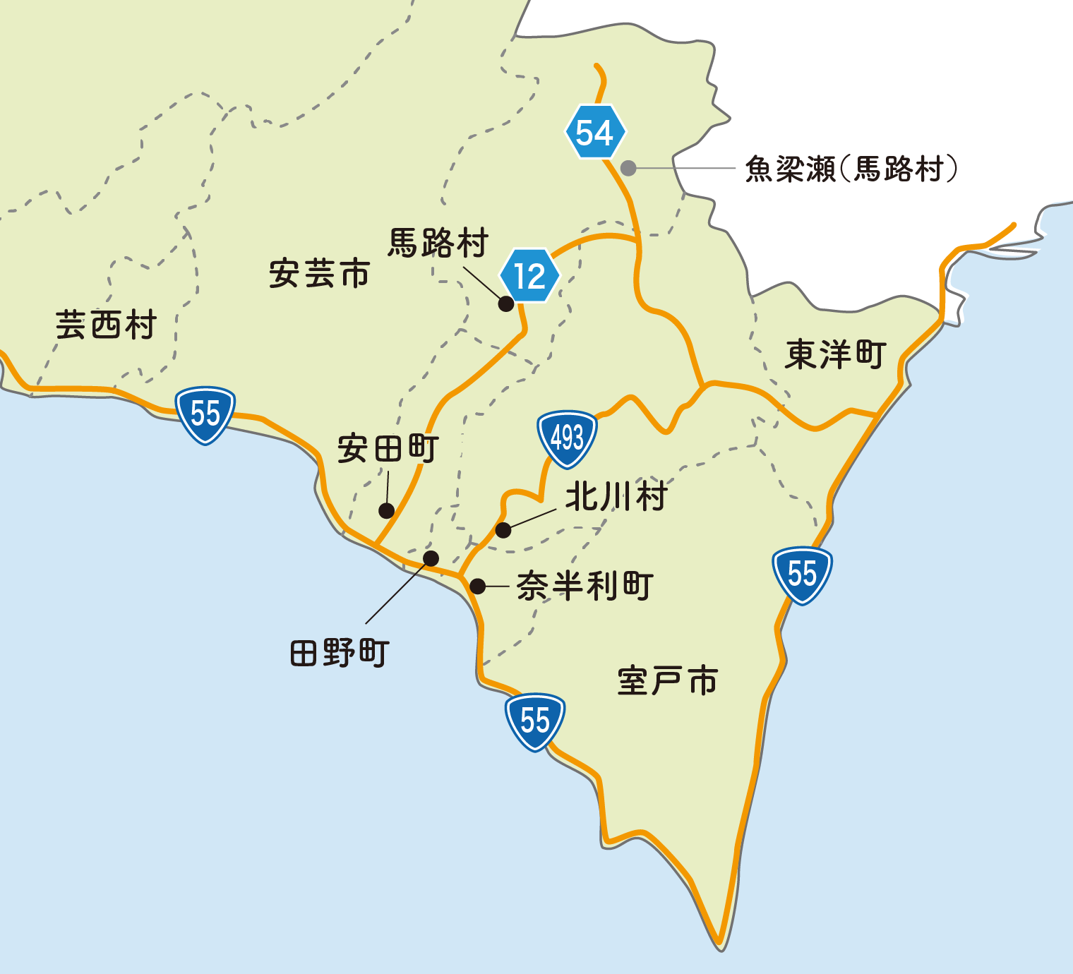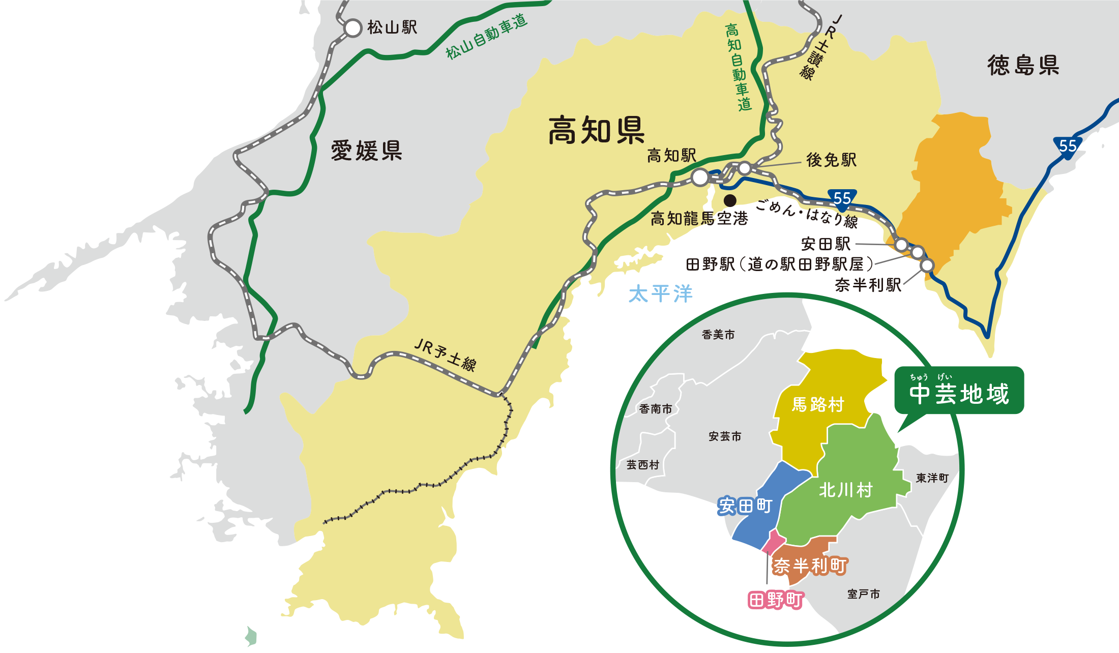 中芸地域へ鉄道でお越しの際は、安田駅か奈半利駅をご利用下さい。 お車でお越しの方も、まずは安田駅か奈半利駅をめざしてお越し下さい