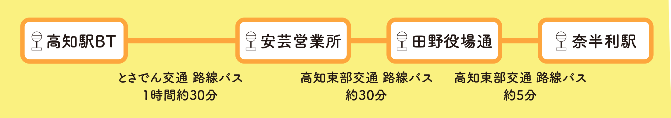 - 高知駅バスターミナルからとさでん交通バスで安芸営業所へ。高知東部交通バスに乗り換え、「田野役場通」または「奈半利駅」で下車。